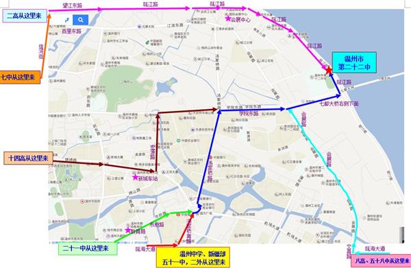 2、温州二高:→过境公路→东欧大道→望江东路→瓯江路→终点(二十二中)