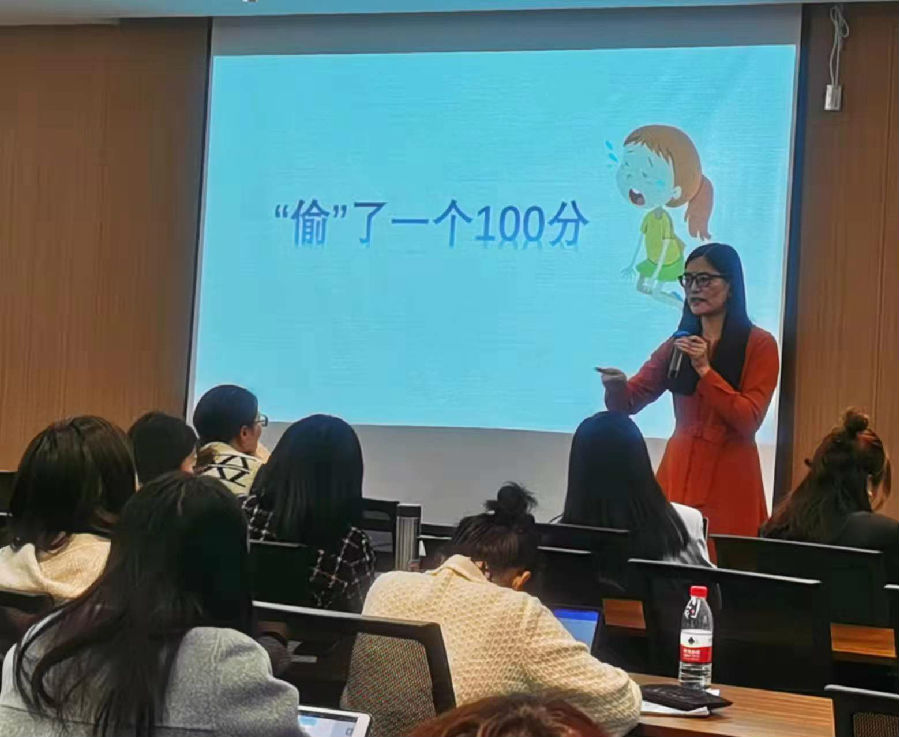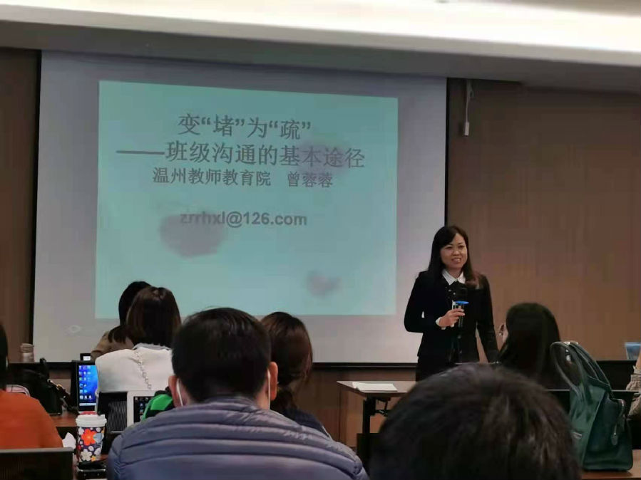 导师曾蓉蓉作《变“堵”为“疏”——班级沟通的基本途径 》专题讲座。曾老师结合省赛题,通过实际演操,向我们介绍了艺术解决学生问题的妙招。同时指出解决问题时要基于“以生为本”的原则,通过创设沟通、了解再做结论,尝试心理换位、学会倾听等策略,以幽默风趣的方式,来艺术解决学生问题。