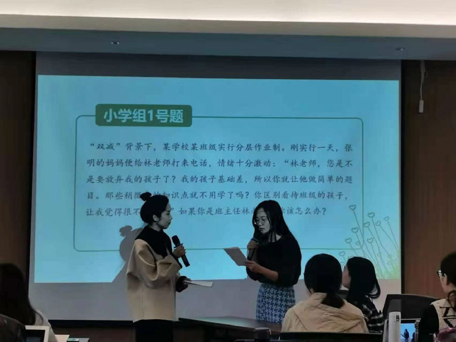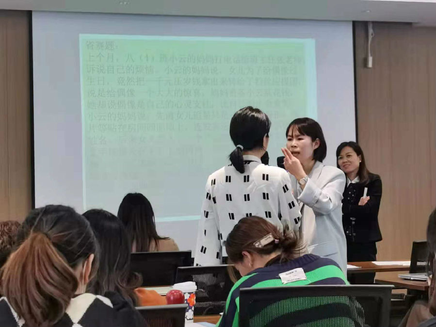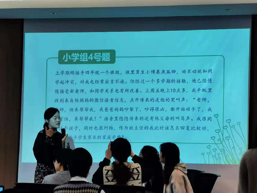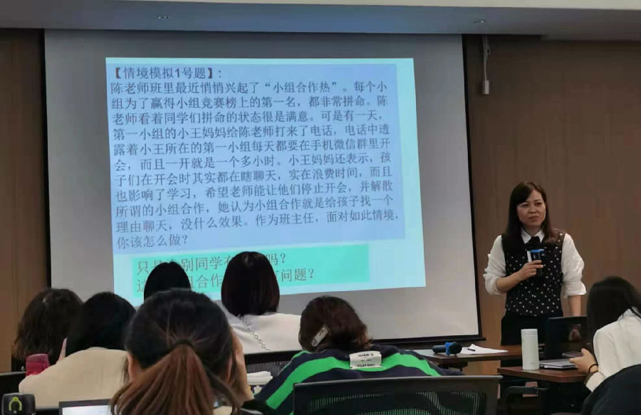 八个真实案例分配到各组。接下来,各组组员热烈讨论,群策群力,从班主任的角度出发,想出最佳的应对方法来解决问题。随后各组对案例进行生动地演绎,在演绎中解决问题,化解冲突,继而是情境阐述和问题答辩,再现了各位学员班主任工作的理念和智慧。活动最后,曾老师对各组精彩的表现做出点评,并提出了新的建议。