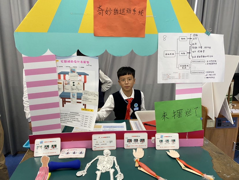 第三节,周盈盈老师的探究课带学生进入具体的规划制作。周老师结合公益摊的基本要求提出了科学的评价标准,学生依照规划流程如火如荼地选择合适的材料去布置摊位,绘本、脑的模型、肌肉模型、解压玩具……花样繁多的材料让学生们显得更加兴奋,摊位周围到处都是学生们的身影和灿烂的笑容。