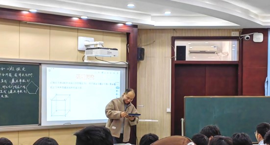 首先是王老师的《正方体中截面问题的探究》。王老师擅长以变式为特色,借助GeoGebra动态演示,探究了正方体中的截面问题。王老师课堂幽默,与学生互动自然,富有想法。