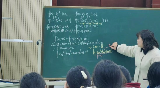 李老师的《三次函数的图像与性质》。李老师从课前作业引入,探究出与三次函数的图像对称性的相关结论,并应用结论解决问题。李老师逻辑清晰,富有亲和力,板书漂亮工整。
