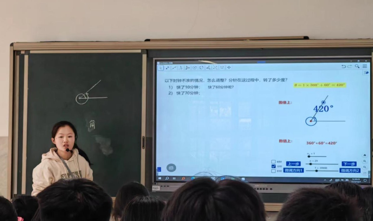 李老师从“周而复始,却也生生不息”的视频引入本节课,借助如何调整闹钟实现旋转量和旋转方向的突破,课堂信息技术的使用特色鲜明。