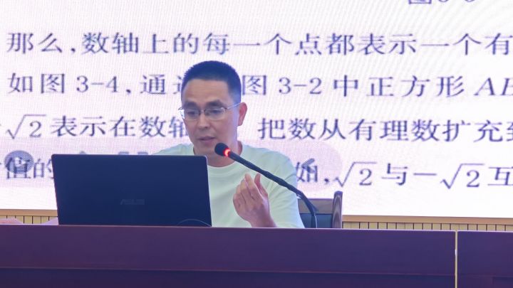 第三章《实数》由来自乐清市城南中学的李鑫老师进行解读。李老师从教材特色、教材比较、教材变化、案例片断等4方面进行解读,指出新教材变化最大的是增加了综合实践活动的内容,综合实践活动可以开展项目化学习,也可以开展跨学科学习,另外在小结与反思中以框图形式表示本章知识要点、发展脉络和相互联系,以问题形式引导学生回忆、总结全章内容。