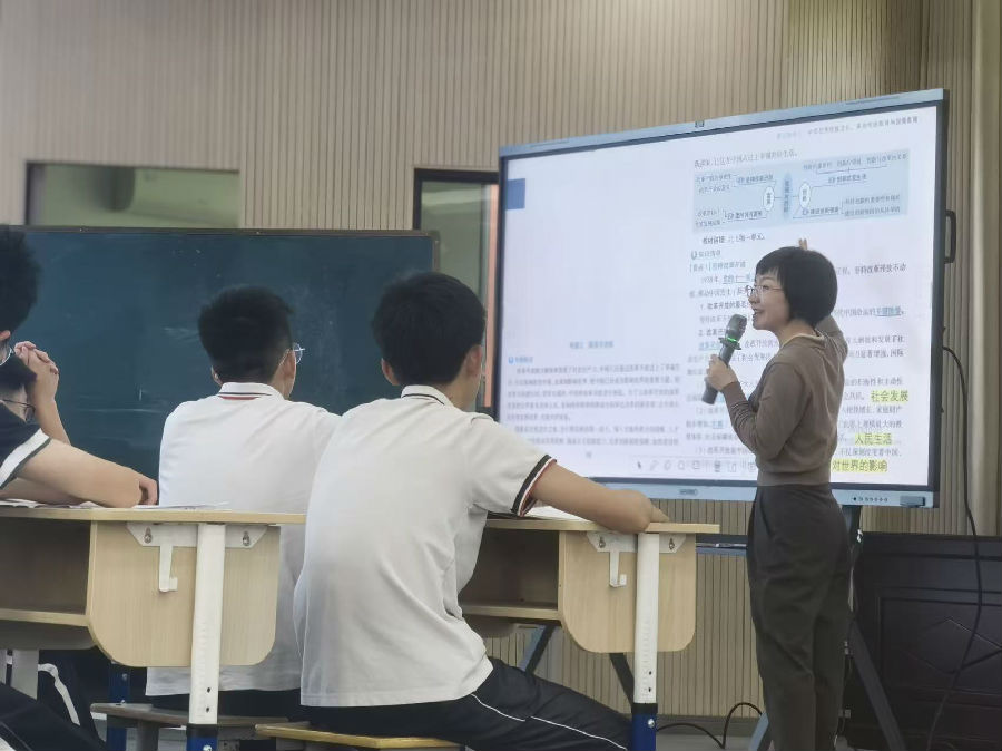 随后,工作室导师、温州市道德与法治教研员王小芳老师执教《国情教育专题试题讲评》示范课。王老师依托真实学情数据,以典型错题为切入点,引导学生重新审视设问,明确设问的要求,并通过材料关联相关主题。通过龙港撤镇设市的发展进程这一经典例题学生的真实作答,引导学生逐步掌握抓取材料关键词、链接学科核心观点的答题技巧。并在组织答案时围绕“现象—理论”有逻辑地表达观点,系统构建“五能应答法”。王老师这一框架不仅破解了学生“知而不会用”的困境,更将答题训练升维为思维品质的锻造,为中考复习提供了可复制的素养培育范式。学生们在互动中体会到:“答题不仅需要知识储备,更需思维路径的清晰构建。”
