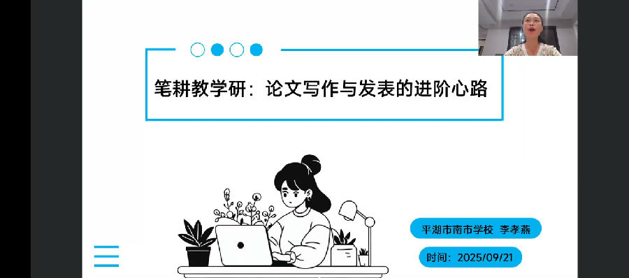 2025 年 9 月 21 日,温州市沈玲飞名师工作室第十七次活动聚焦教师专业成长核心需求,特邀嘉兴平湖市南市学校英语教师、浙派名师培养人李孝燕老师,带来《笔耕教学研:论文写作与发表的进阶心路》专题讲座。作为嘉兴市学科教学带头人、浙江省 “教改之星”,李老师深耕一线教学十余年,累计发表论文 30 余篇(其中 6 篇被人大复印报刊资料全文转载),主持课题 10 余项。她以 “言意兼得” 的教学主张为引领,凭借 “教学研一体化” 的实践智慧,为工作室教师打造了一场兼具理论高度与实操价值的 “科研赋能课”,点亮论文写作与专业发展的进阶之路。